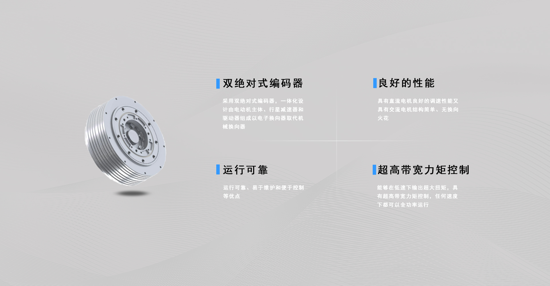 BM系列直流無刷電機采用雙絕對式編碼器,一體化設計由電動機主體、行星減速器和驅動器組成以電子換向器取代機械換向器,既具有直流電機良好的調速性能又具有交流電機結構簡單、無換向火花、運行可靠、易于維護和便于控制等優點,能夠在低速下輸出超大扭矩,具有超高帶寬力矩控制,任何速度下都可以全功率運行